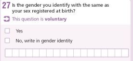 A quick word about the census. There are two questions of particular interest to us. Q3 is: sex? Answer: male or female. A note tells you a question on gender identity follows later. Q27 (voluntary): is the gender you identify with the gender you were assigned at birth? Answer: yes or no and write your new identity.