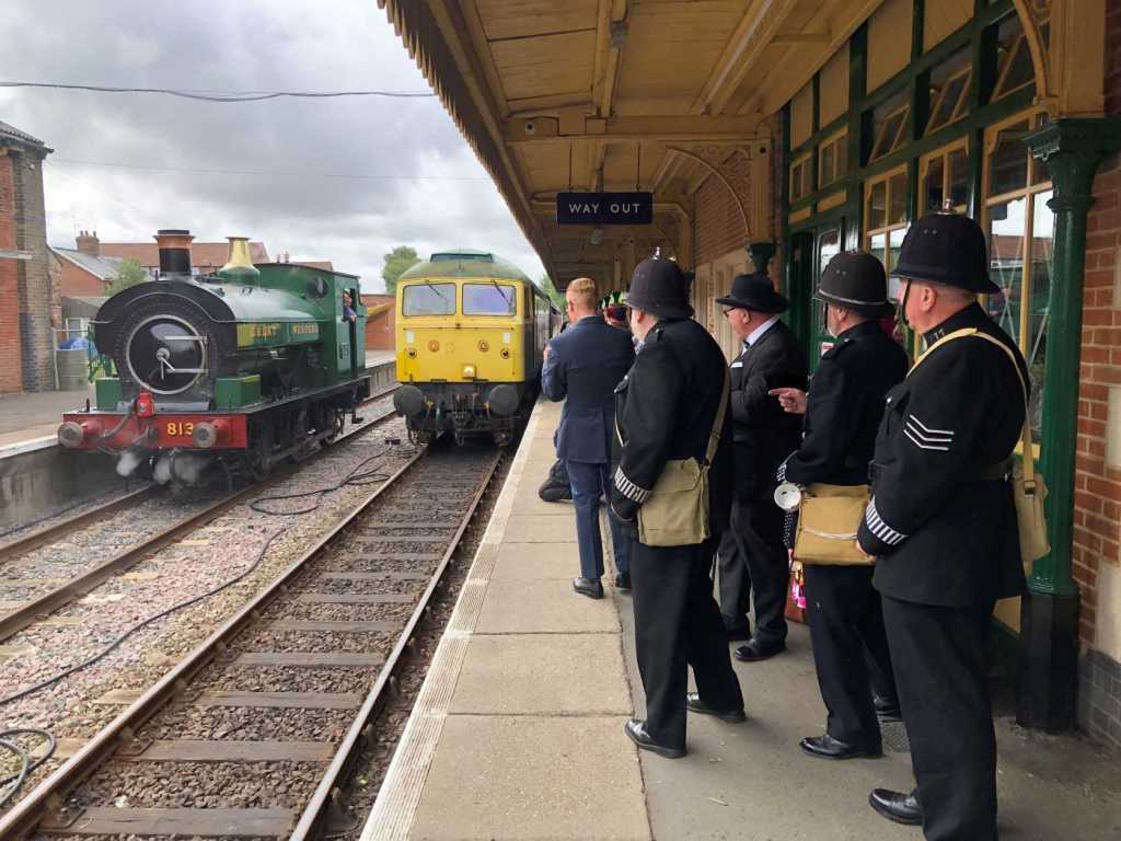 A good Oasis turn out included Beccie, Lauren, Claire & Jules, Serena, Joy & Ralf, Katie, Lorraine and myself Theresa, we all met in the station café for a quick refresh of teas and coffees, the café and the whole station was decked out in 1940’s wartime theme with event participants wearing authentic clothing and uniforms, some visitors also dressed the part adding to the nostalgic atmosphere. The train was due to depart for Wymondham Abbey station at 10:30 so we assembled on the platform alongside the local Bobbies.
