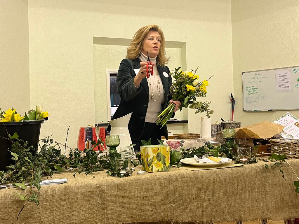 Que Katie. Like Debs before her, Katie used her incredible enthusiasm and outstanding communication skills to demonstrate wild flower arranging. Before our very eyes unpromising bits and pieces of hedgerow, using the humble ivy as a backbone, were turned into a beautiful bouquet.