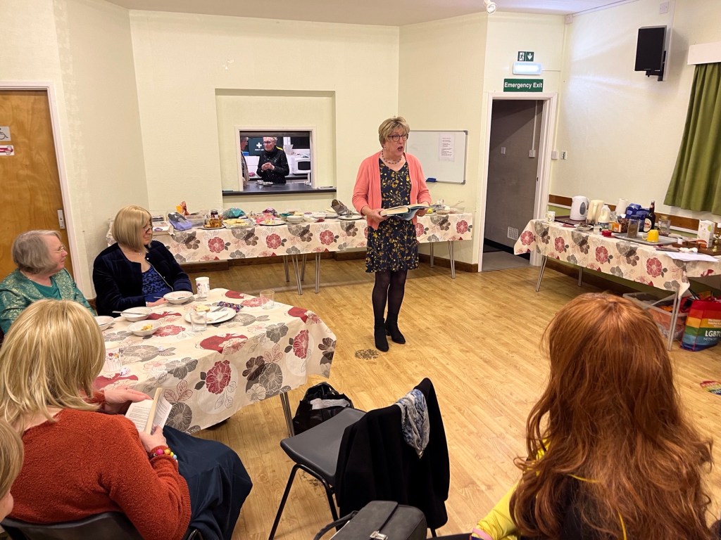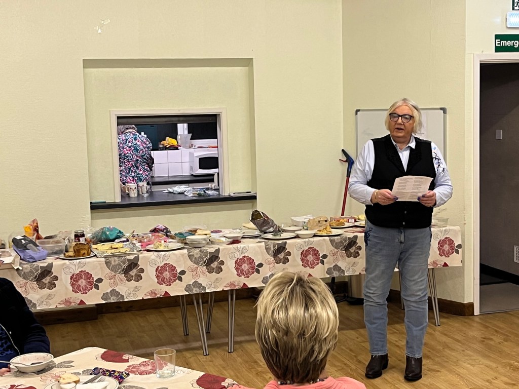 Our evening weav’d a wond’rous tale of gl’rious st’ries. Geri hath shown h’r romantic side by regaling us with the ballad of Harp-Weaver by Pulitzer prize winning auth’r Edna St. Vincent Millay. Carole remind’d us of her wond’rful wit by reading a selection of witty poems from Candy is Dandy by Ogden Nash. V’ry much in Carole’s voice.