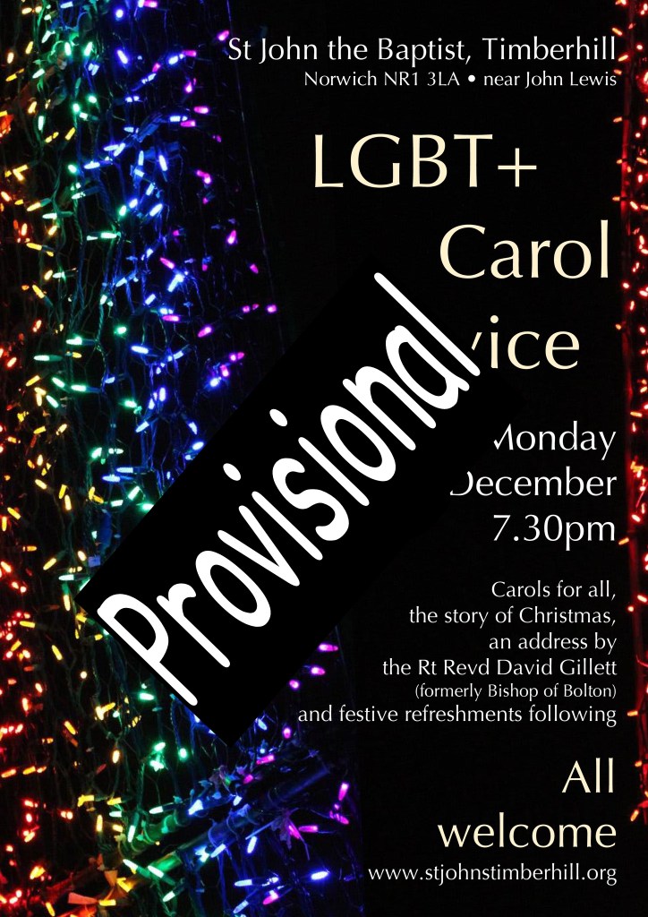 Monday 18th December at 7.30pm.This year’s LGBT+ Carol Service will be at St John the Baptist, Timberhill, NR1 3LA in Norwich. This ever popular service includes favourite Christmas carols and readings. Full details of the service will be available soon.