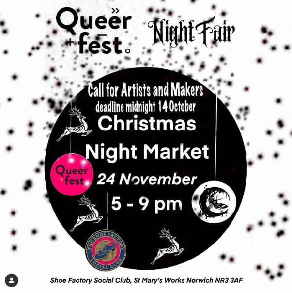 Friday 24th November 2023. The Queer Fest organisers are holding a Christmas Night Market from 5:00 pm to 9:00 pm at The Shoe Factory Social Club, St. Mary’s Works, St. Mary’s Plain, Norwich NR3 3AF. A curated market of LGBTQIA+ artists and makers, selling a wide range of products from art, original prints, photography, ceramics, cards, jewellery, badges, clothing and hopefully some mulled wine! I will be their and I hope you will come and join me for a bit of pre-Christmas shopping. Drop me a line or email me at oasisnorfolkinfo@gmail.com.