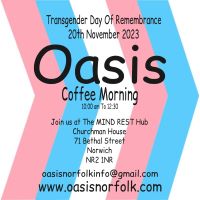 Monday 20th November 2023. Commemorate Transgender Day Of Remembrance with Oasis. We will be holding a coffee morning in the library at The Mind REST Hub in the centre of Norwich nr The Forum . The coffee morning will run from 10:00 a.m. to 12:30 p.m. and Oasis will be providing a cup of instant or tea and even a digestive. If anyone would like something stronger or sweeter, The Feed Café is to be found in an adjacent room, where the Mind charity benefits from purchases from the café.