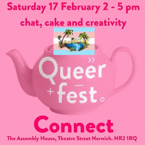 Saturday 17th February from 2:00 – 5:00pm. At The Assembly House in Norwich come and join Oasis and the Queerfest team for a cup of tea, some cake, games and a chat in the beautiful Novere Rooms.