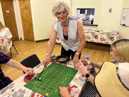 As we entered the casino we were met with lots of new and familiar faces, welcome to Jaz and Robin to their first meetings, the first of many we hope, welcome to Sarah from Ely Pride, welcome back to Emma-Jane, Claire, Jules, Diane, welcome to Georgina S’s sis Kate, welcome to one and all. Doesn’t the croupier look a lot like Serena? Now Madame, show me the money!!