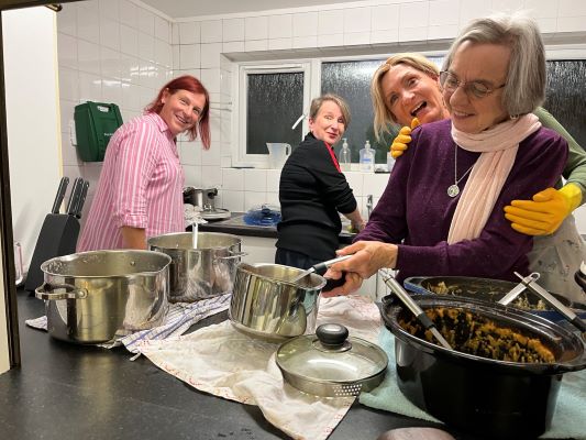 Throughout the evening our little kitchen was a veritable hive of activity. A very special thanks go to Alice, who is the best second lieutenant ever. Alice’s calm ‘can do’ approach ensured that dinner and pudding were served hot in a smooth and efficient manner; plus working with Carole, whizzed through the washing up in a flash. Other ‘can doers’ and washerupers included Emma, Barbara, Rebecca and our very own ‘tail end Jaqui’, Jaqui. Simply brilliant. The biggest thank you goes to all of you who gave so much of yourselves to the meeting.