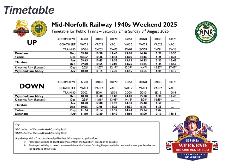 🚂Sunday 3rd August 2025 The Mid Norfolk Railway 40’s Weekend. From 11:00 am Oasis will make it’s annual pilgrimage to the Wartime MNR. We will gather at Dereham Station in time to catch 11:40 am Up Train to Wymondham aboard Loco 80078. Please note, if you pre-book your ticket using this link you will save £5.00 on the cost of a day rover ticket. It’s a wonderful day, with the opportunity to wear your vintage clothing.