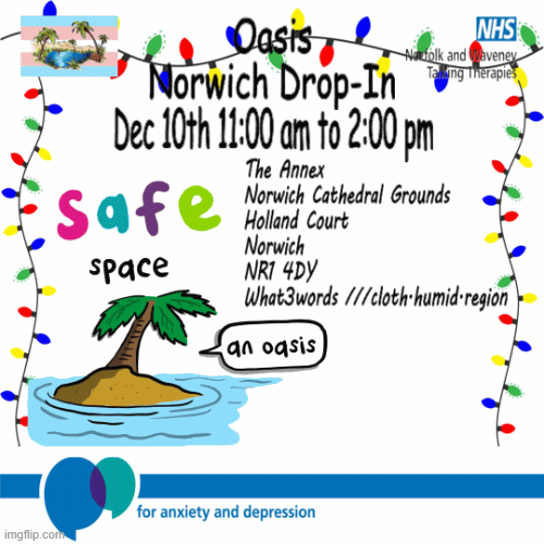 💖Thursday 10th December 2025 The ‘2nd Thursday‘ Oasis Drop-In Sessions continue in Norwich and King’s Lynn. Looking for an Oasis friendly face, a listening ear, or just a safe space to be yourself? Our Oasis Drop-In sessions are here for you! Whether you are new to Oasis or a familiar face, everyone is welcome to pop in for a cuppa, a chat, or simply to relax in a supportive and affirming environment.