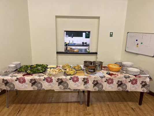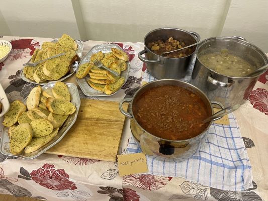 Oasis is family. Families eat together, and each month that’s what our Oasis family do. For many years dinner at Oasis was synonymous with Vicky, who has cooked for our group many times; so it was a trill to welcome Vicky back to our little kitchen. Vicky provided a scrumptious Italian meal. We enjoyed pasta with three sauces, including our usual vegetarian option, followed by Italian Roll topped by scrumptious double cream. Thank you Vicky!