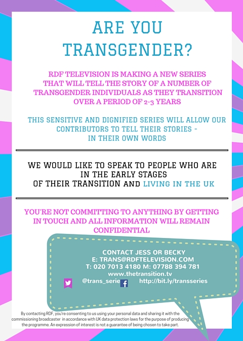 Jessica Hartley is a producer working for RDF television on a project about transgender people. The series hopes to follow up to ten individuals, from the very early stages of their transition, across various aspects of their lives over an approximately two – three year period. They want to chat to as many people as possible at this stage of production (confidentially – this information will go no further) to understand a variety of experiences and find a diverse range of trans people who would like to take part.
